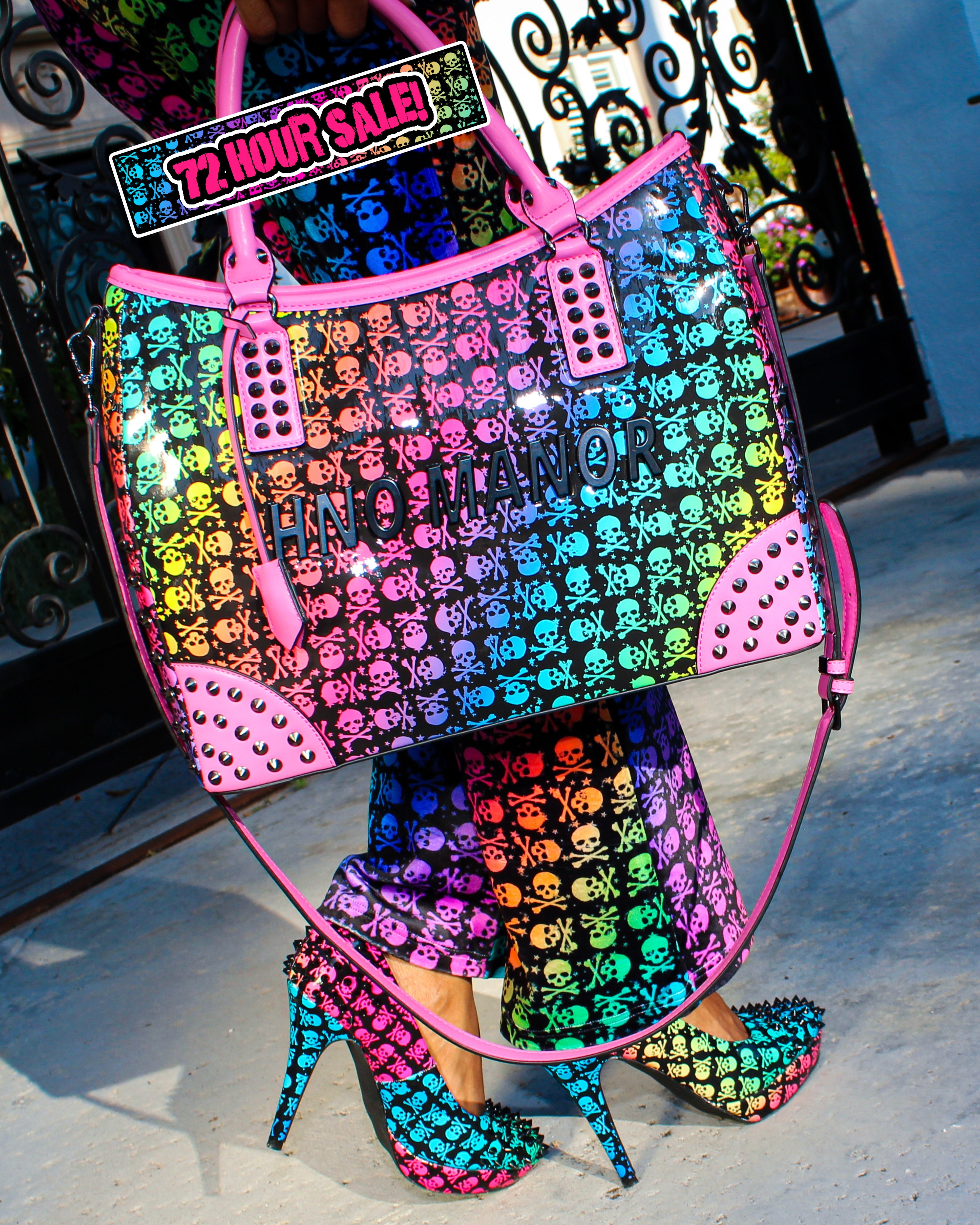 Loud. Luxe. Legendary. The Skull Candi Handbag turns every sidewalk into a runway. High-gloss rainbow skull print with the bold HNO MANOR logo front and center, this tote is pure attitude. Finished with pink studded corners and side panels.