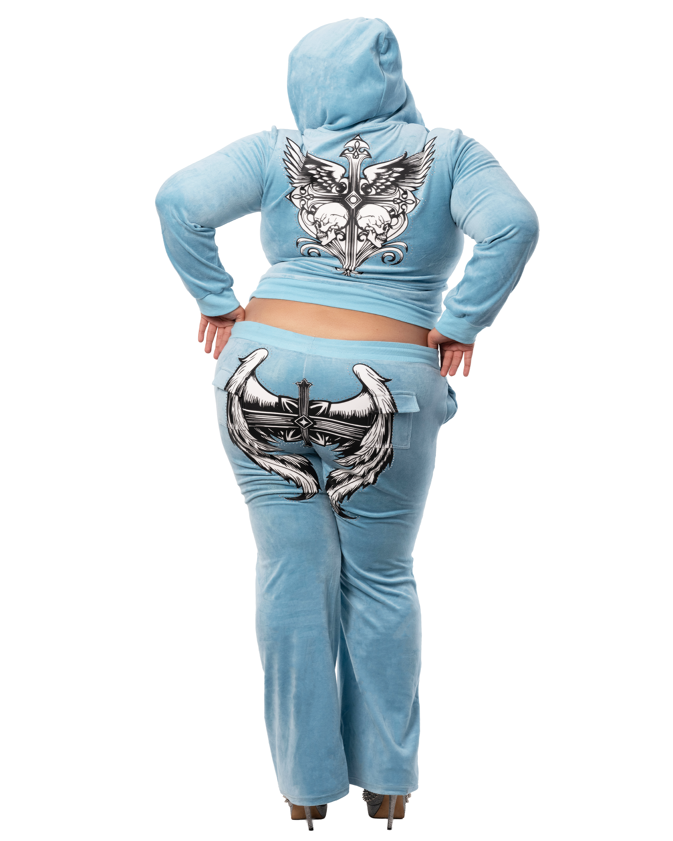 Velour jacket featuring a gothic winged cross graphic finished with rhinestone detailing.