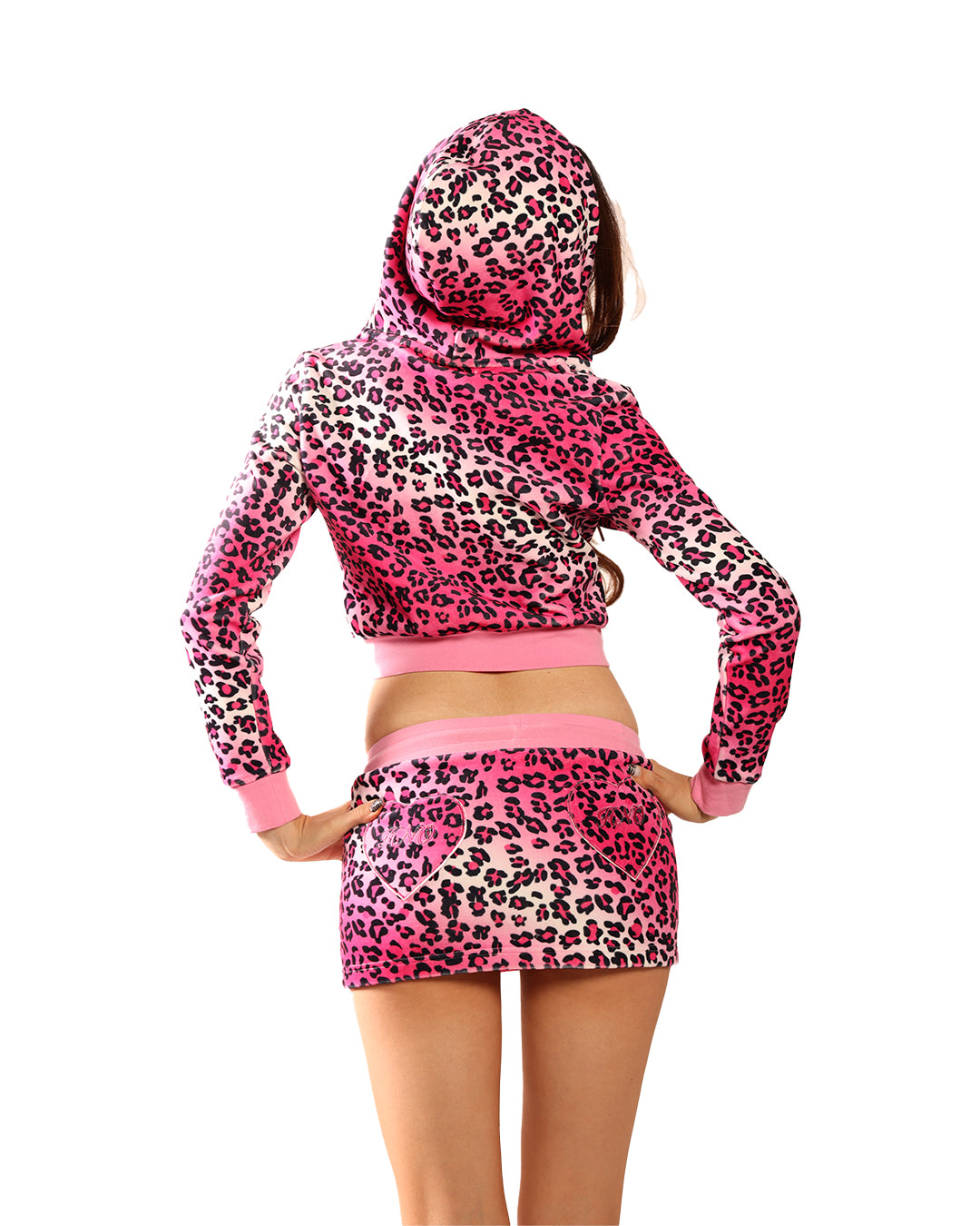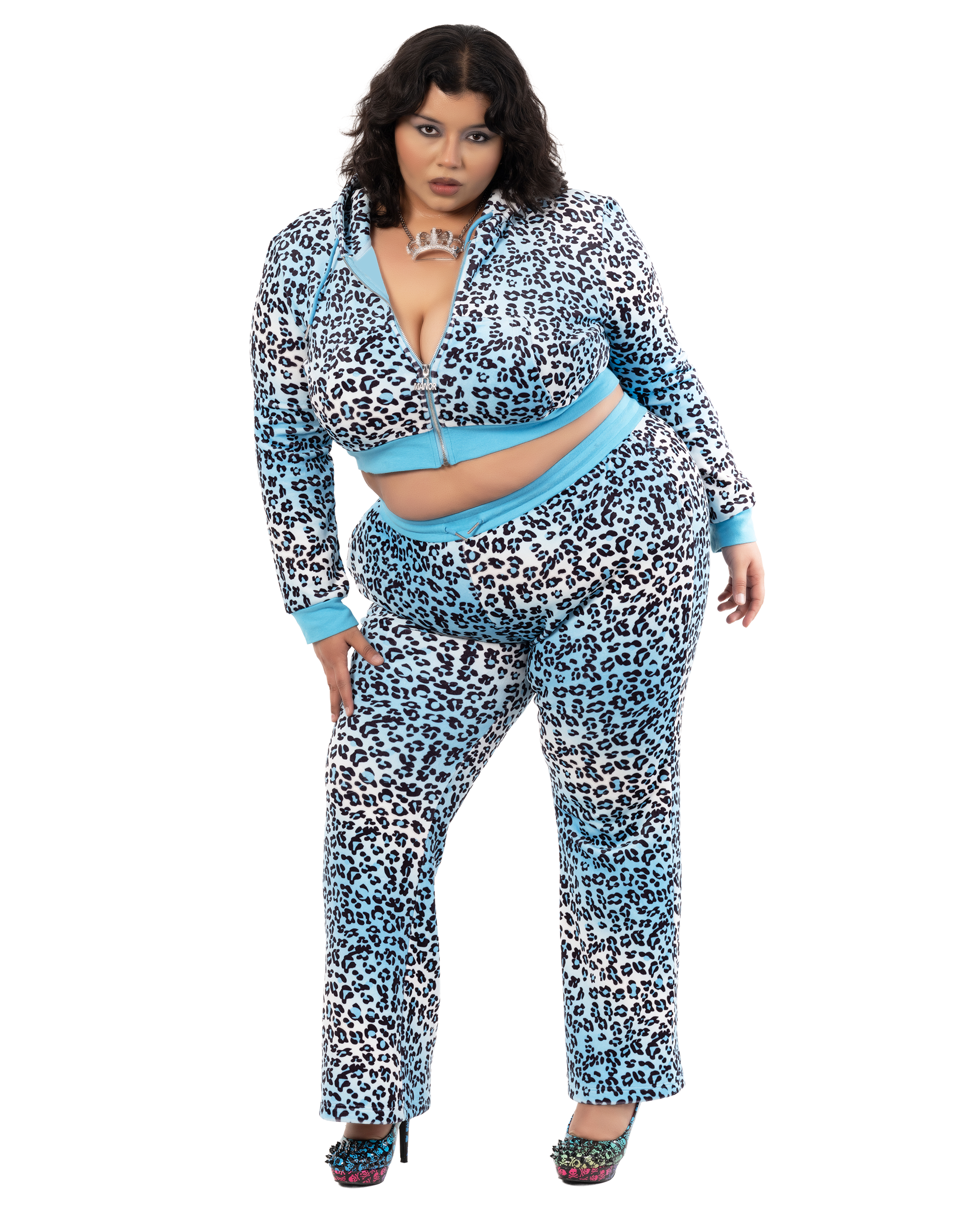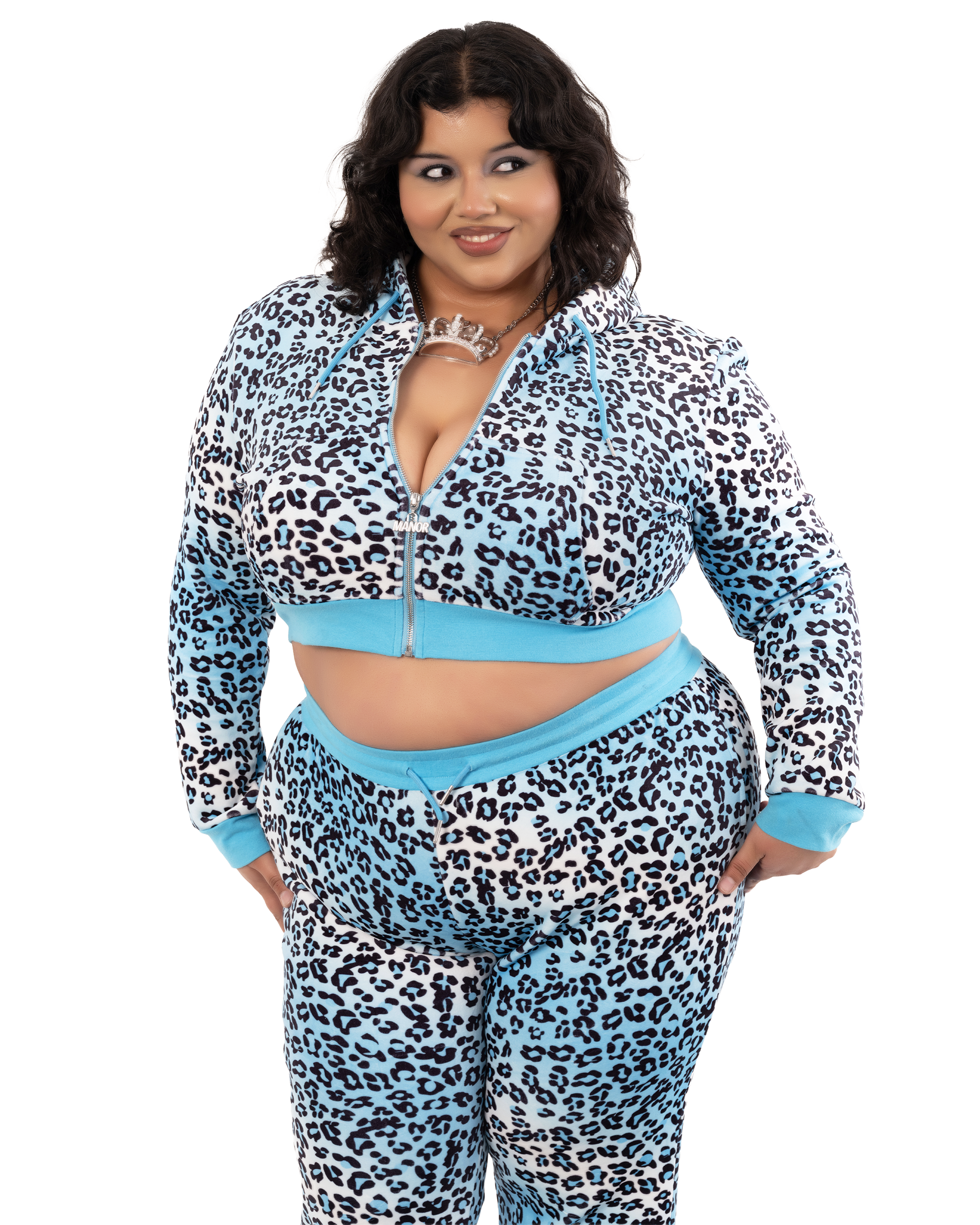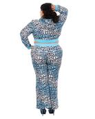 Blue Leopard Model is 5'7" and is seen wearing a size 3XL with a cropped jacket. Pink Leopard Model is 5'10" with a 33-25-35 frame, and is shown wearing a size X-Small with a cropped jacket. Brown Leopard Model is 5'8", typically wears a Small, and is shown wearing a X-Small set with a full-length jacket.