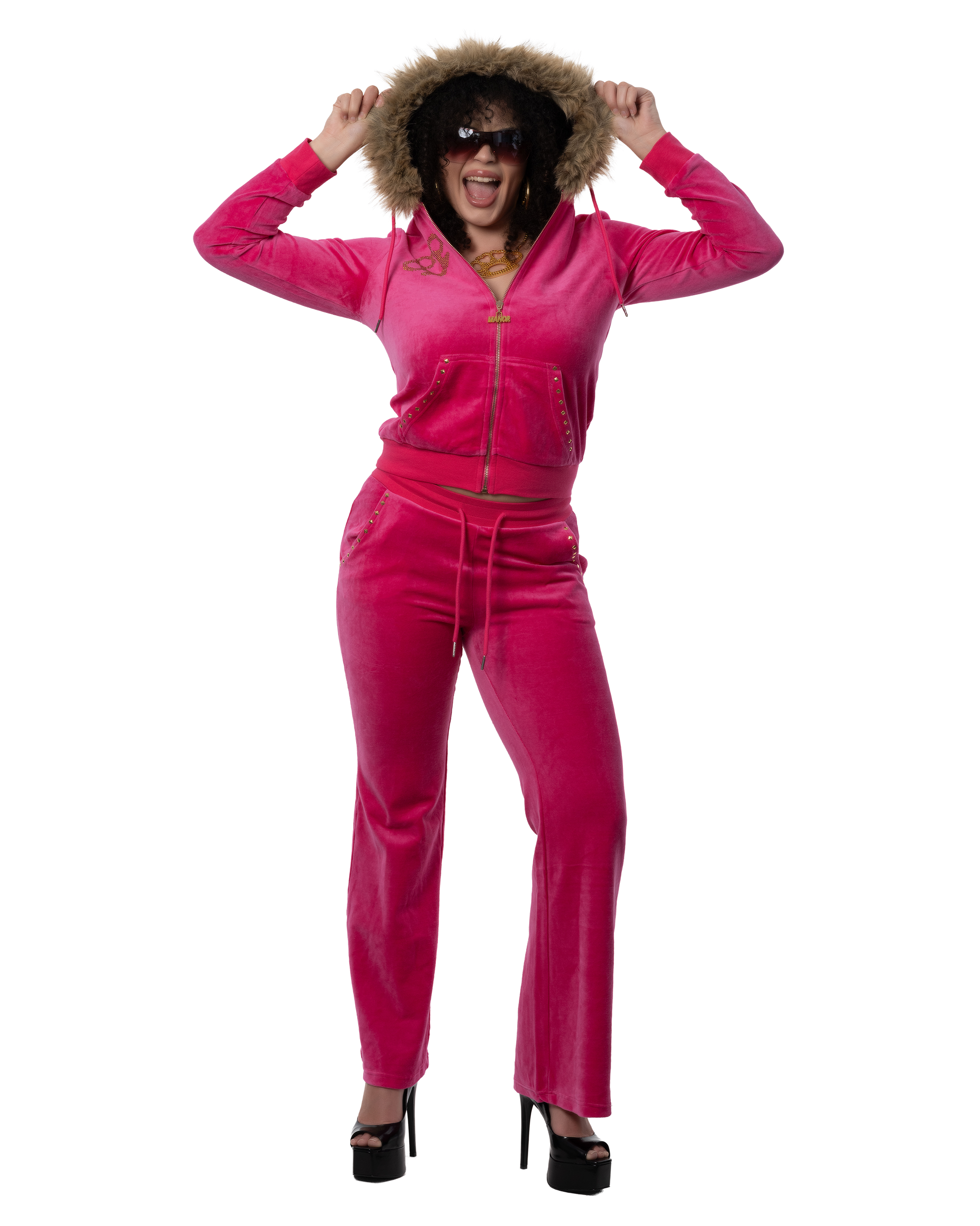 Velour tracksuit featuring rhinestone brass knuckle graphics, faux fur trim, and silver pyramid stud detailing. Designed with a structured yet soft feel for a edge.
