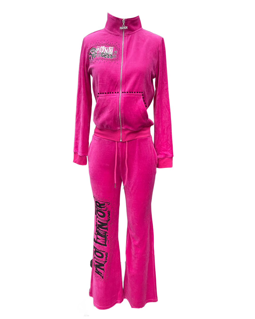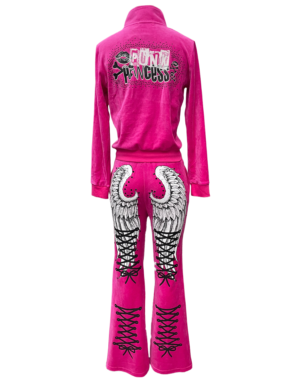 Velour tracksuit featuring bold rhinestone graphics, winged detailing, and a hidden rhinestone stamp inside the waistband.