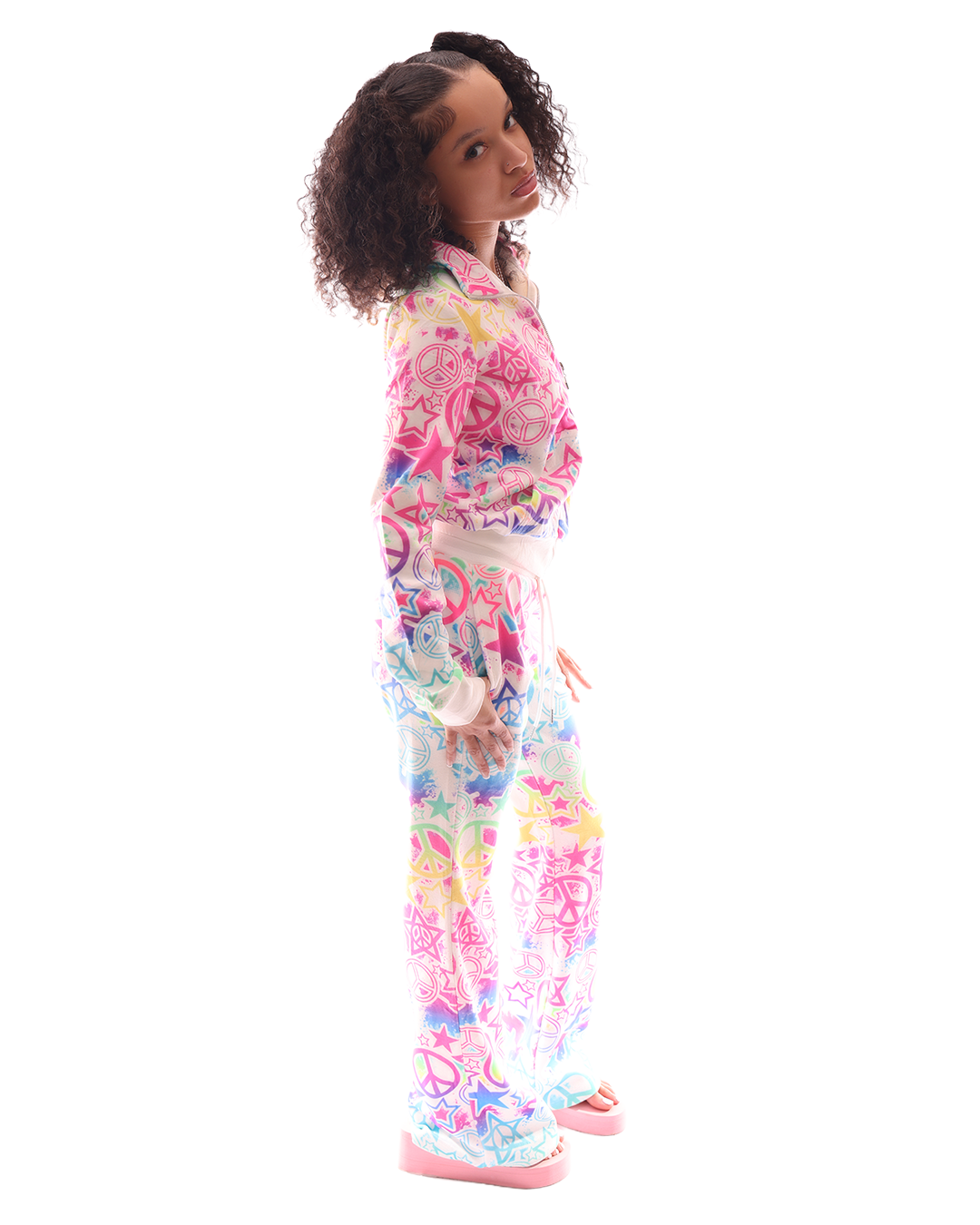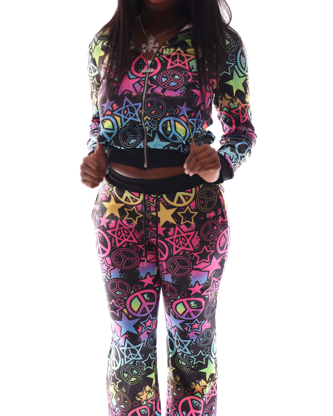 The Peace & Glam Collection redefines playful luxury through a kaleidoscope of color and attitude. Designed for the girls who live boldly, this collection captures the essence of freedom, confidence, and glam in true HNO MANOR fashion. Every piece embodies the balance of chaos and couture: peace signs, stars, and radiant color. The full set includes cropped and full-length jackets, flared pants, and more, all crafted to make a scene in the best way possible. This collection marks the beginning of the Peace & Glam era: a world where fun meets fashion at its highest level. Select pieces are handmade, others ready to ship, and the look will soon expand into matching purses, heels, and accessories. More than a collection, Peace & Glam is a lifestyle. For Manor Girls who crave color, confidence, and couture. Welcome to your next obsession.