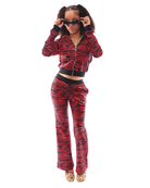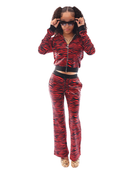 The Red Zebra Tracksuit brings pure 2000s rebellion meets luxury energy. Bold, wild, and unapologetically glam! This set is made for the Manor Girls who refuse to blend in. Designed in plush red-and-black velour with a full faux-fur hood.