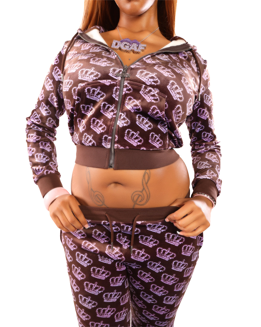 The Crown Tracksuit V2 delivers a bold take on casual luxury. Designed for Manor Girls who thrive in standout moments, this printed velour set combines early 2000s attitude with modern polish. Featuring a plush texture and soft inner lining, it’s made to turn heads while keeping you comfortable from day to night.