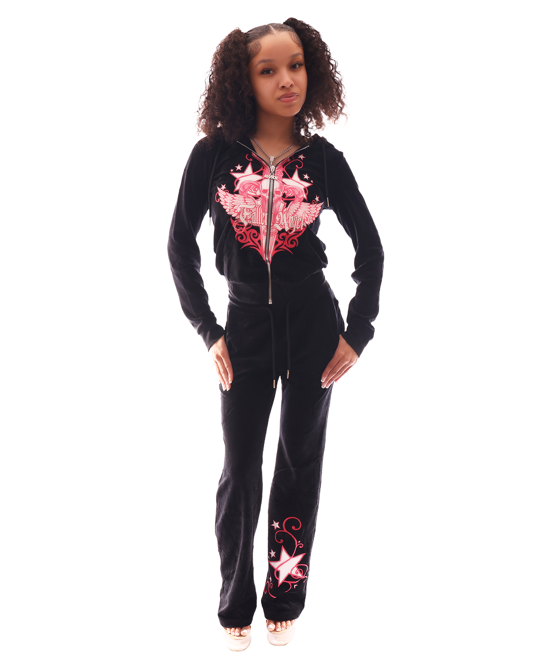 The Fallen Angel Tracksuit is giving serious vintage 2000s glam with a bold edge. Featuring our iconic Fallen Angel Manor graphic, this soft velour set is made for Manor Girls who love their fashion with a little rebellion.