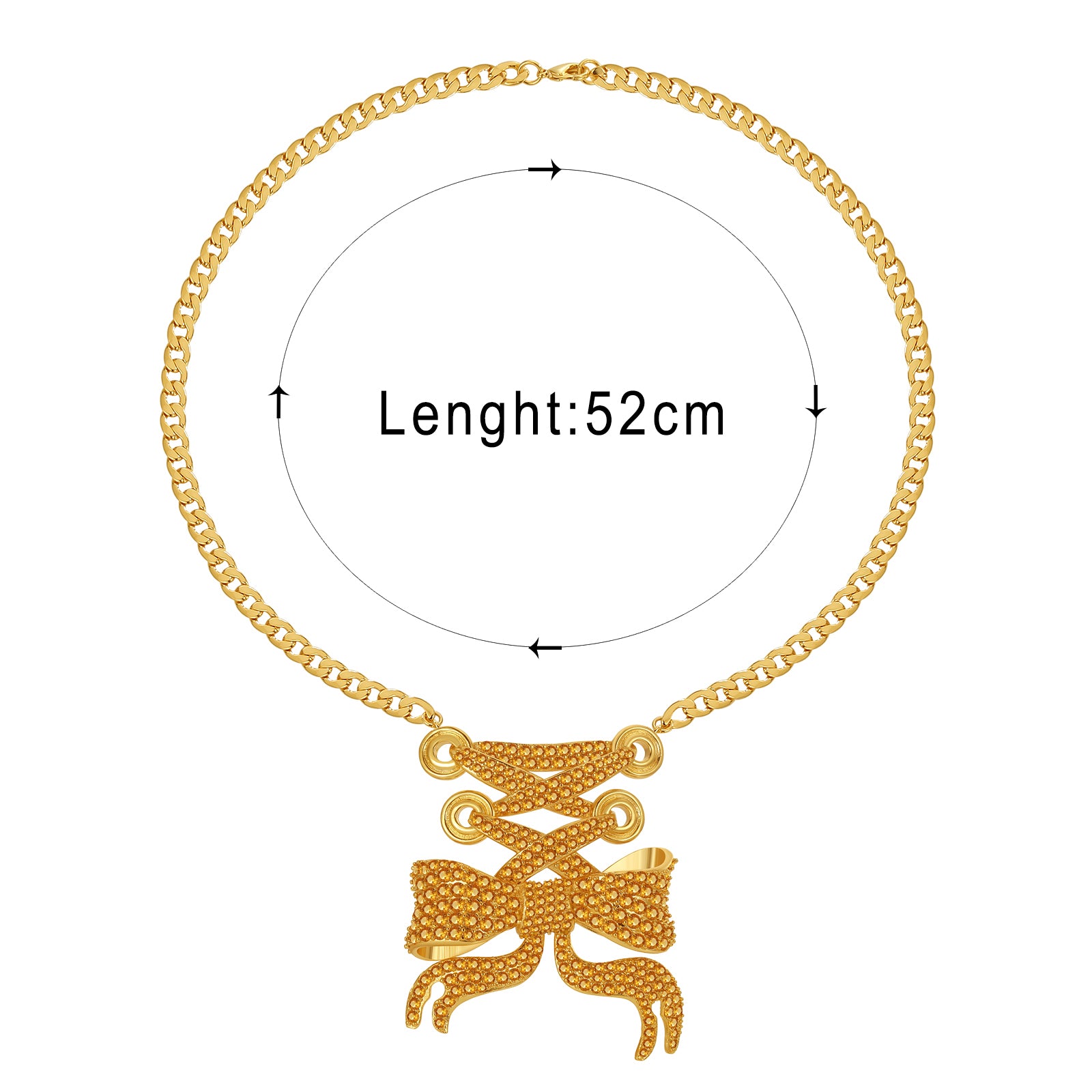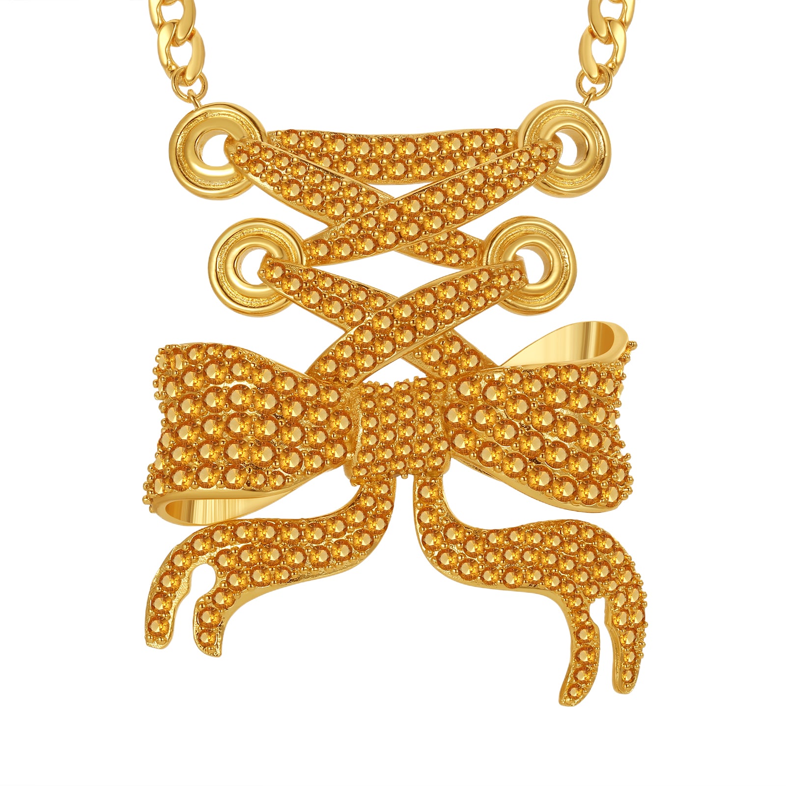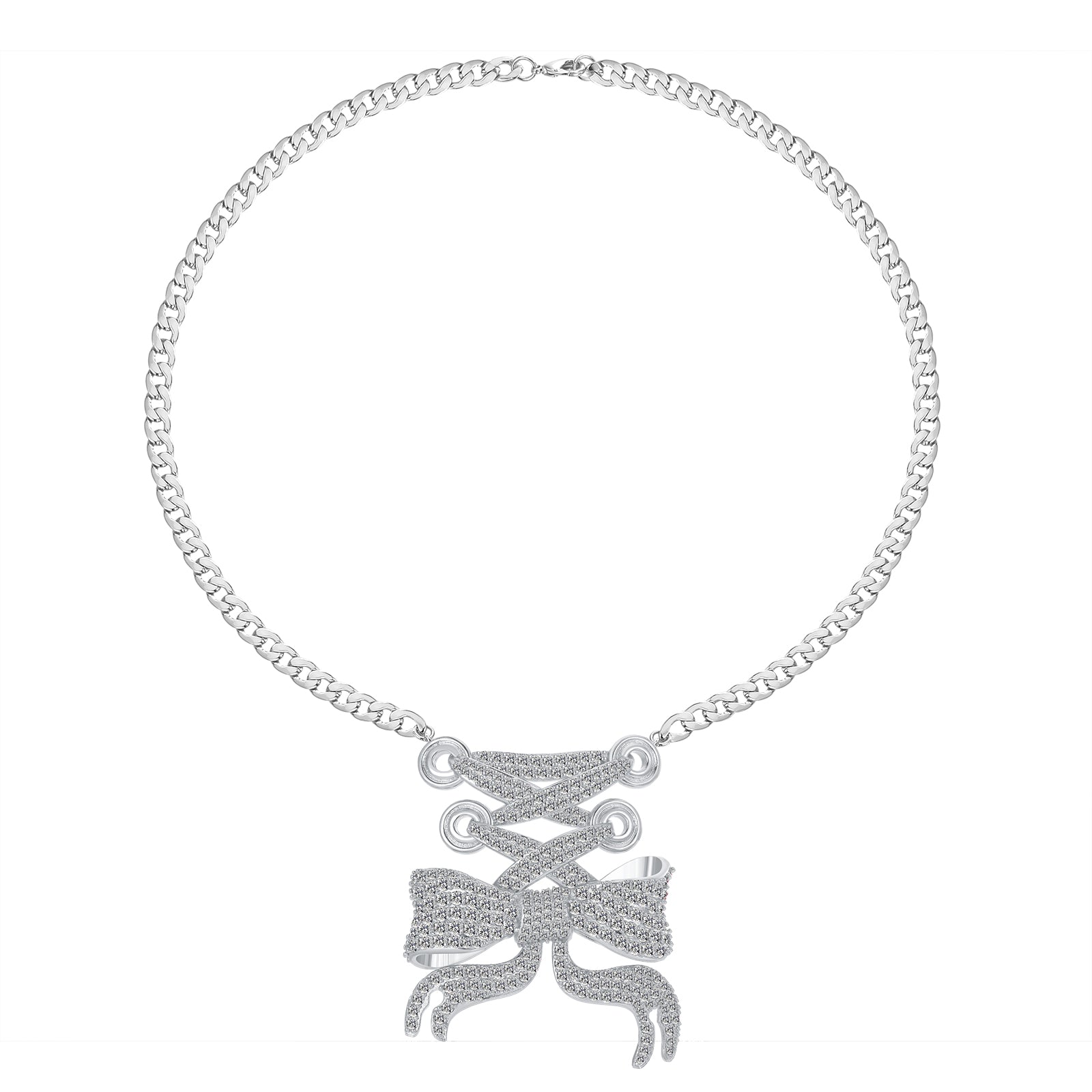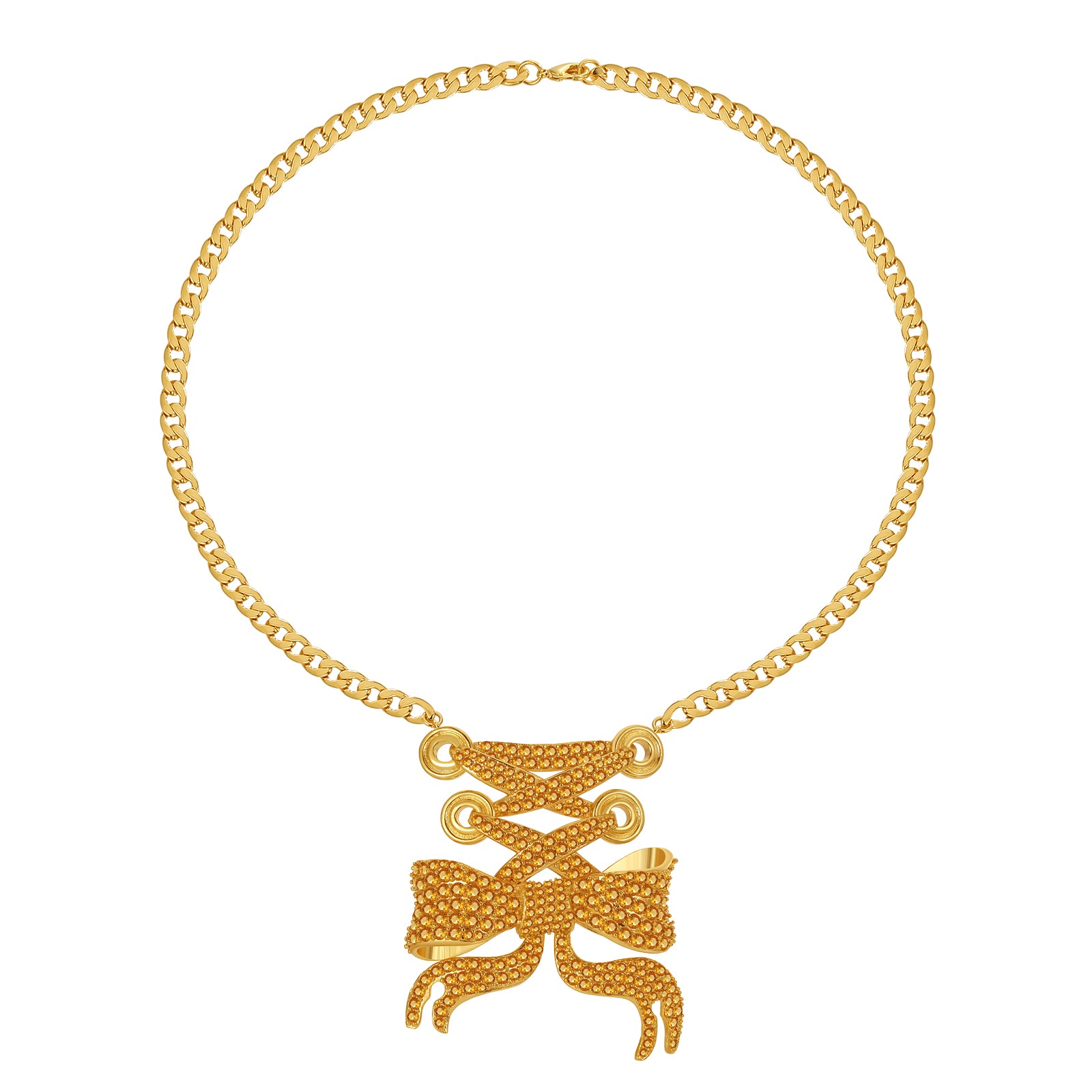 Brass corset silhouette necklace with high shine PVD platinum finish.