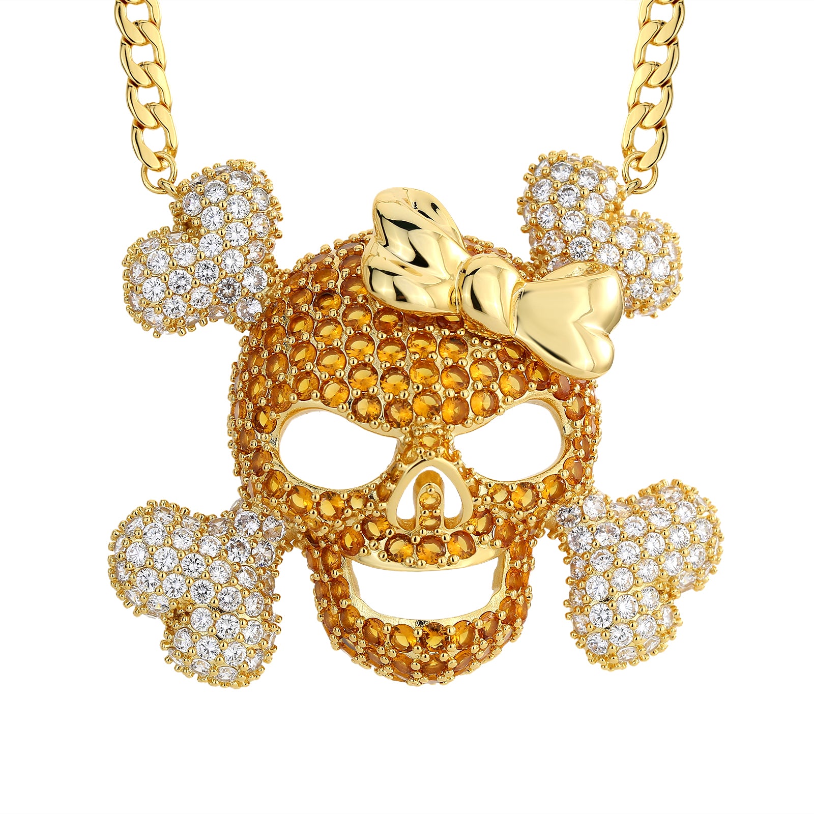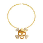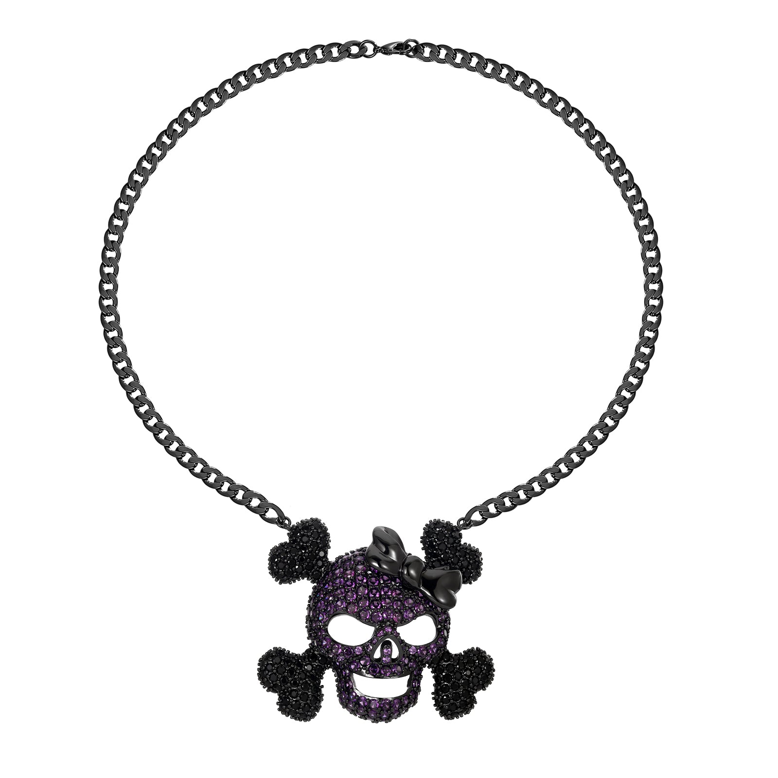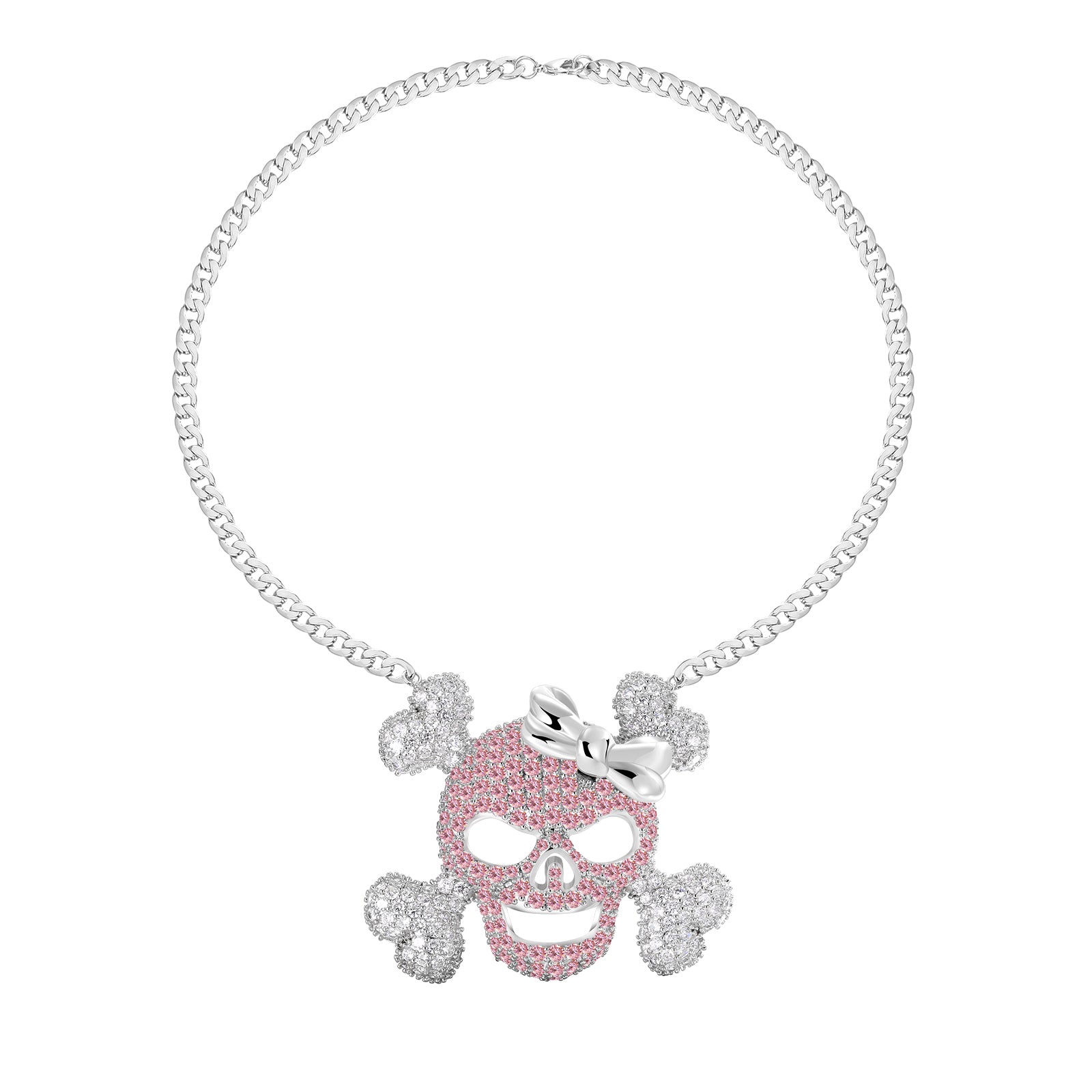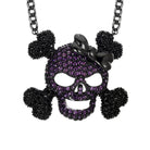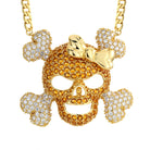 Brass skull and crossbone necklace with high shine PVD platinum finish.