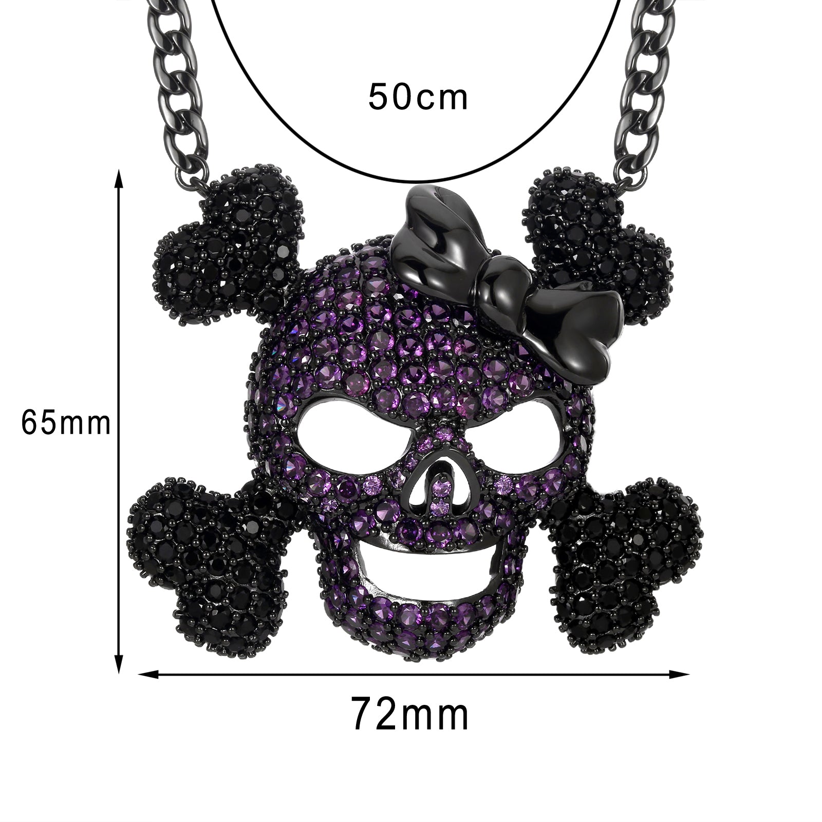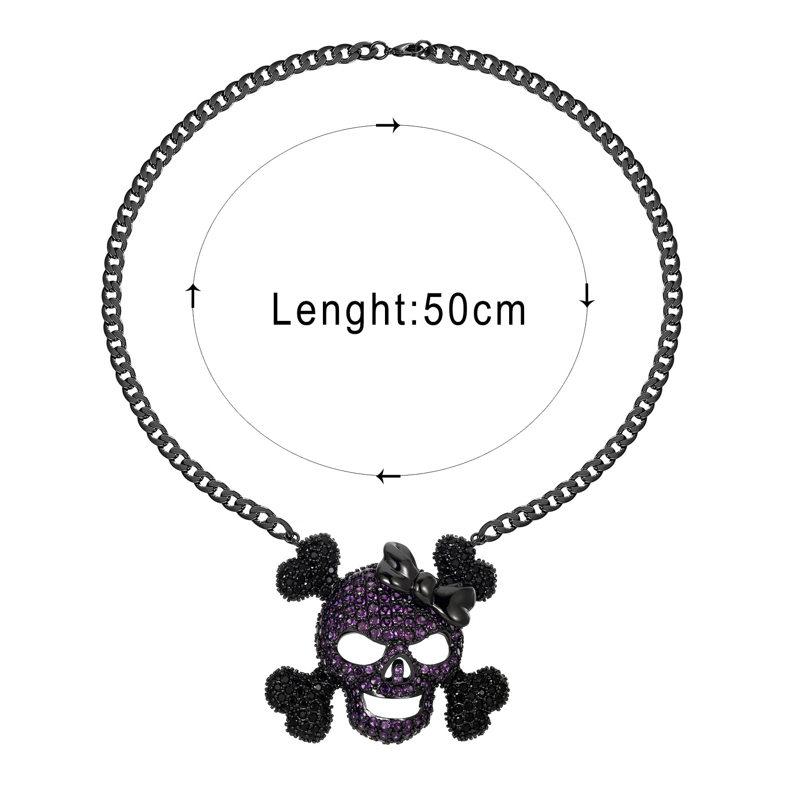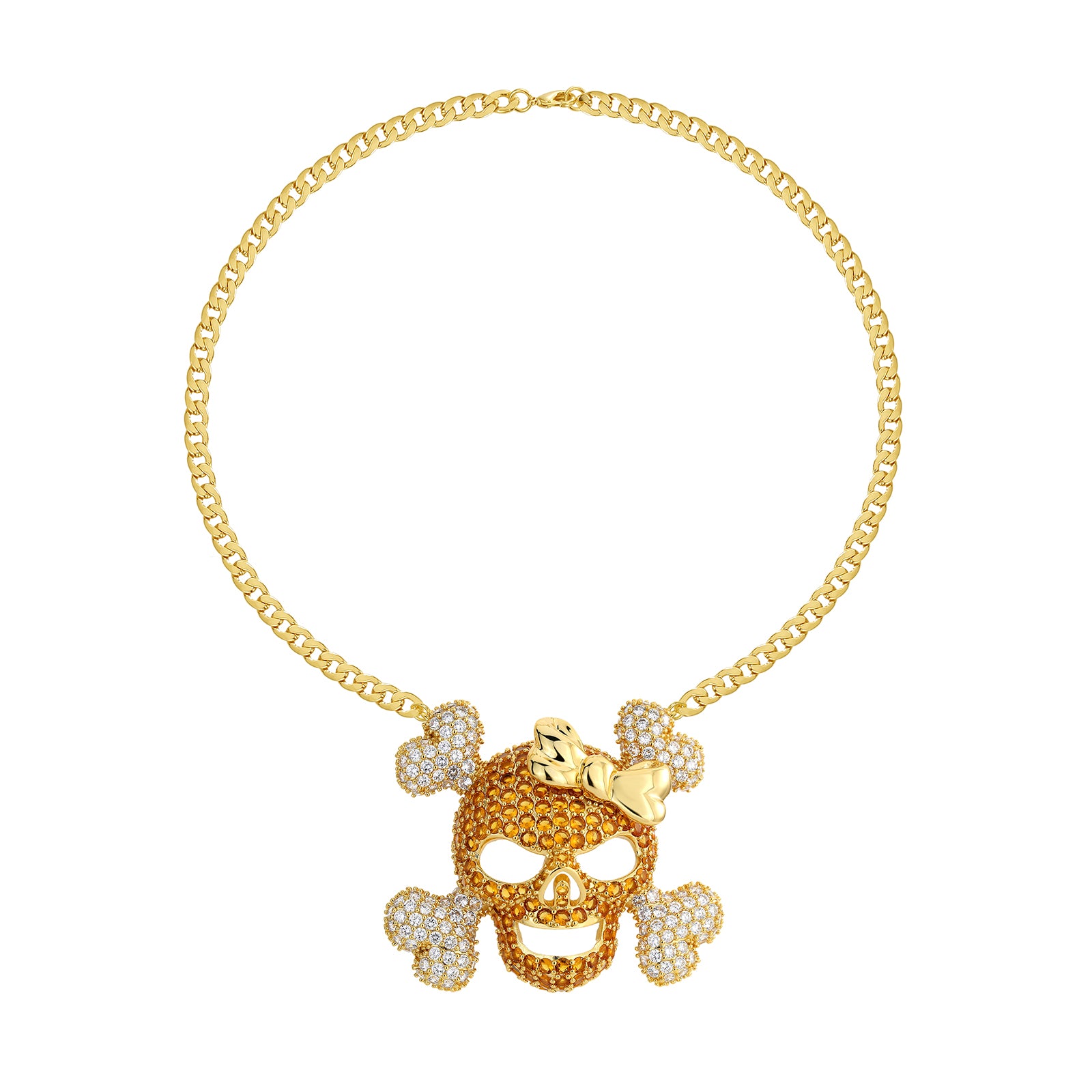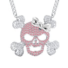 Brass skull and crossbone necklace with high shine PVD platinum finish.