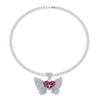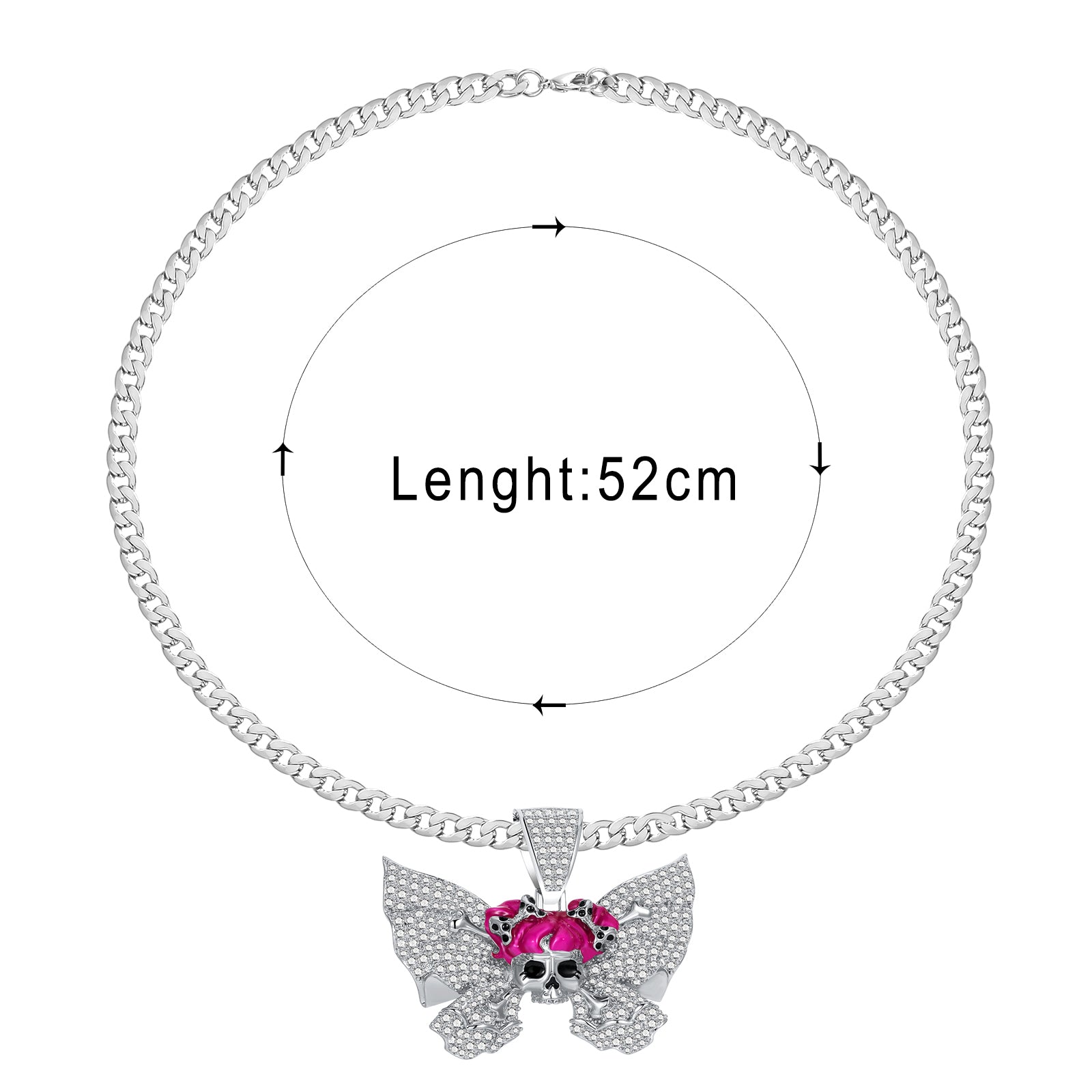 The Glam Reaper Necklace presents a striking composition: a rhinestone-encrusted skull, articulated butterfly wings, and a sculpted bow that softens the silhouette. Each element is designed with clarity and dimension, creating a balanced interplay between dark romanticism and modern glamour.