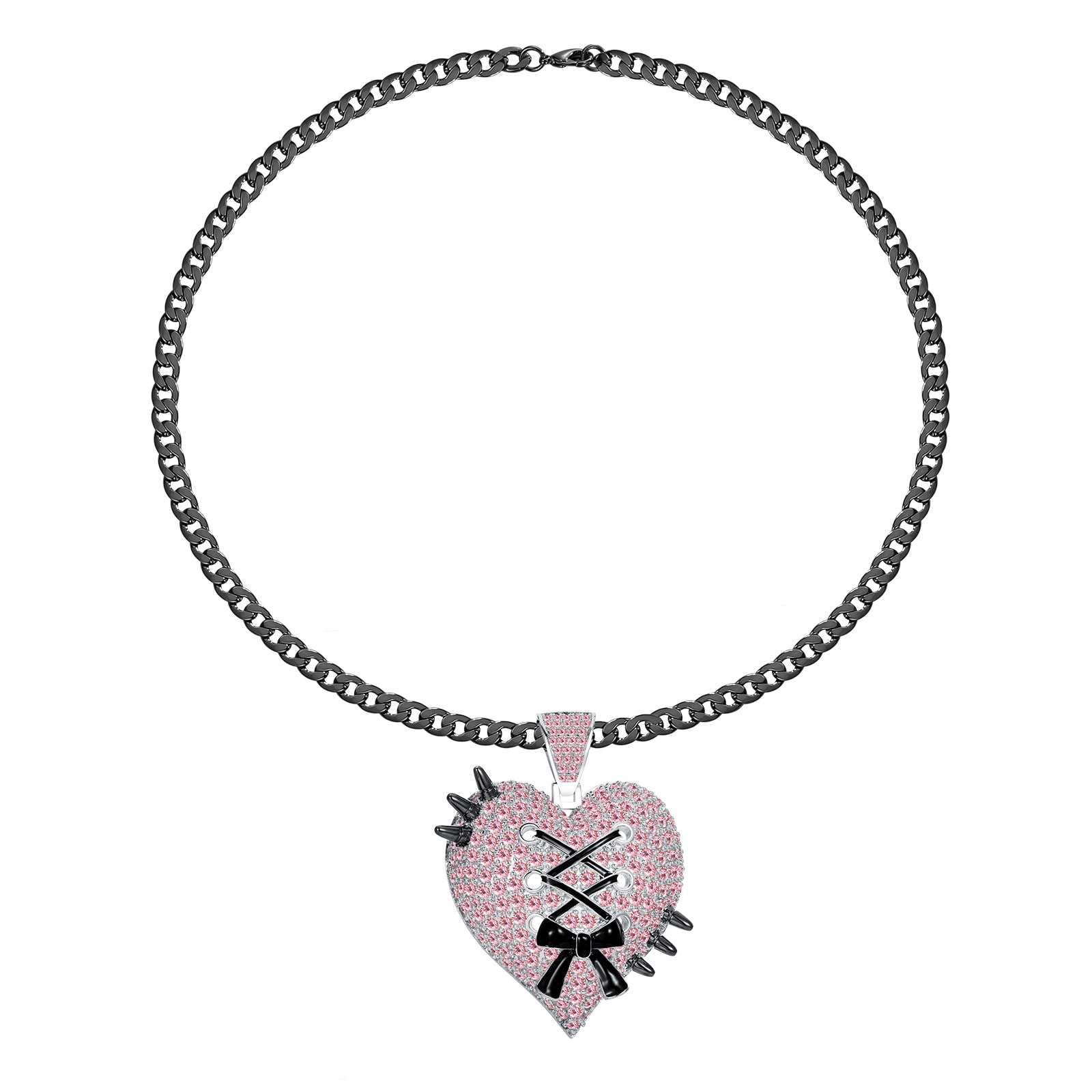 The Spikey Sweetheart Necklace pairs a rhinestone-adorned heart with sculpted spike detailing and a refined bow accent.